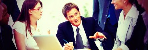 Handsome business man explaining project to colleagues during meeting